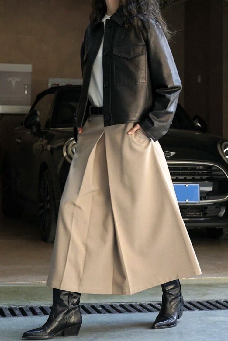 - Funkcionális ajánlat, amely hordható blúzzal, bőrkabáttal és cowboy csizmával.
