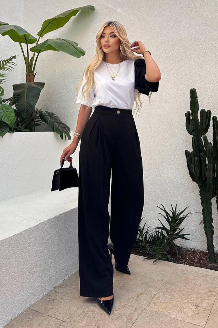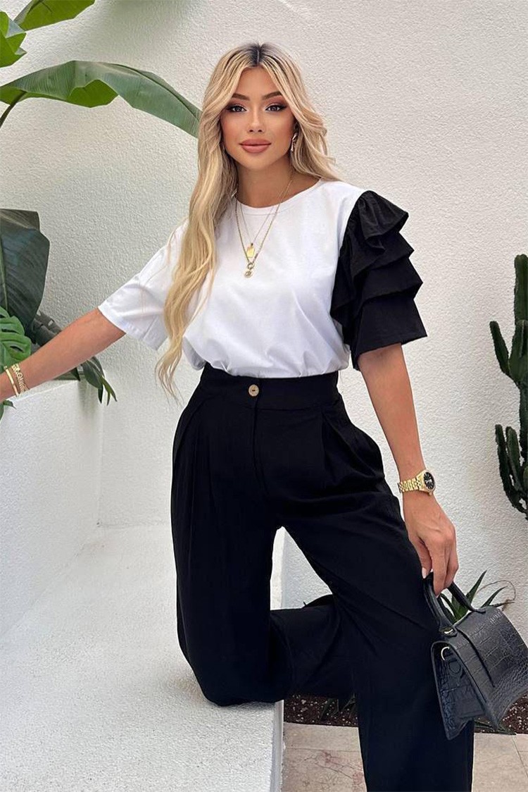 A légies, magas derekú nadrág és a hangsúlyos ujjú póló kombinációja minimalista és emlékezetes megjelenést teremt. A sziluett természetes és diszkrét módon hangsúlyozza a nőiességet.