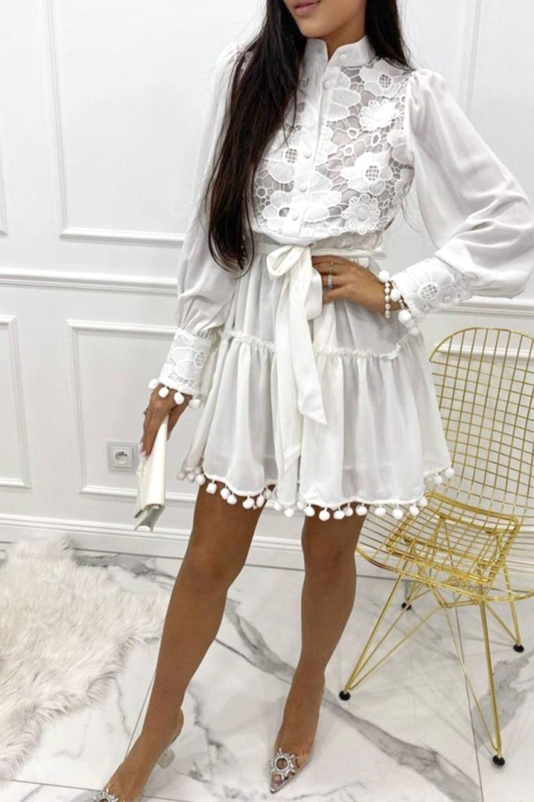 - A modell hosszú ujjú, bő fazon, csipkével és szalaggal az elején.