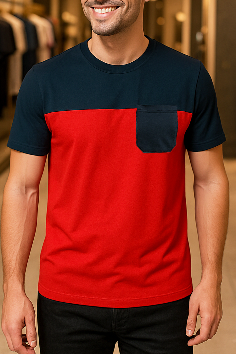- Férfi póló kontrasztos színekben, bordázott kerek nyakkivágással és egy oldalsó zsebbel, mindennapi használatra alkalmas.