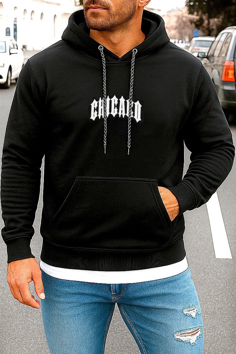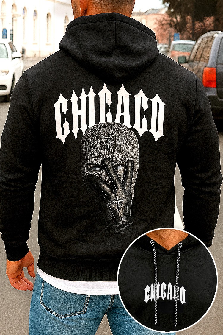 - A fekete háttér kiemeli a hátoldalon található lenyűgöző grafikát - egy részletes illusztrációt maszkos arccal, amelyet egy látványos betűtípusú, nagyméretű CHICAGO felirat egészít ki.