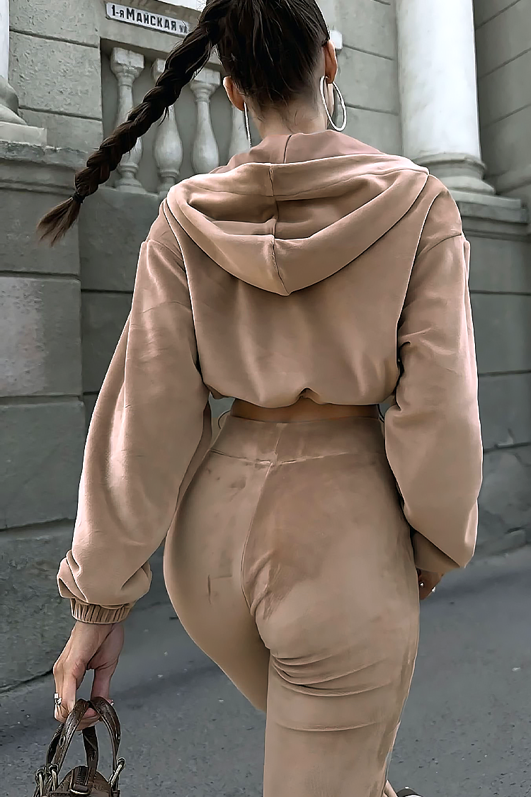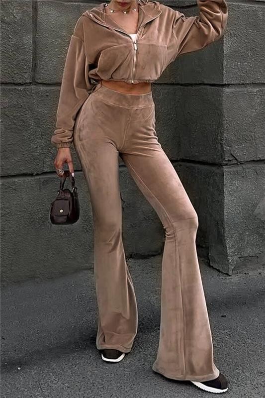 - A kardigán rövid szabású és kapucnis, a nadrág pedig testhezálló szabású és magas derekú.