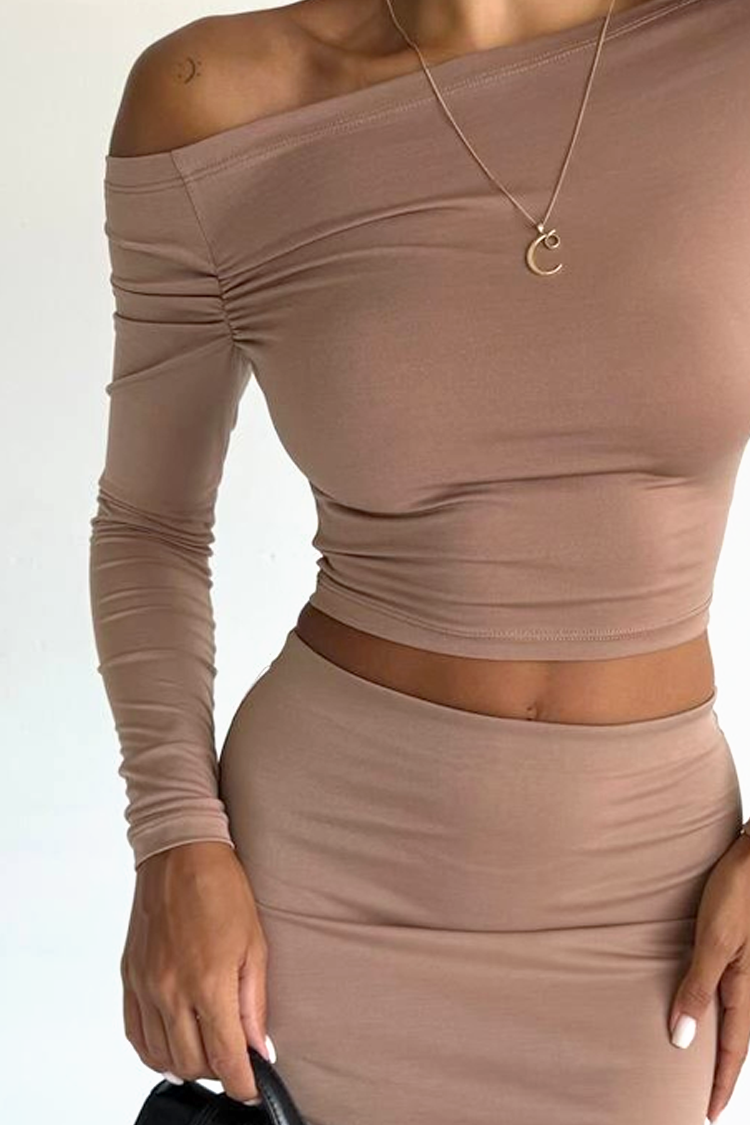 - Elegáns, kétrészes szett - felső és hosszú szoknya bézs színben.