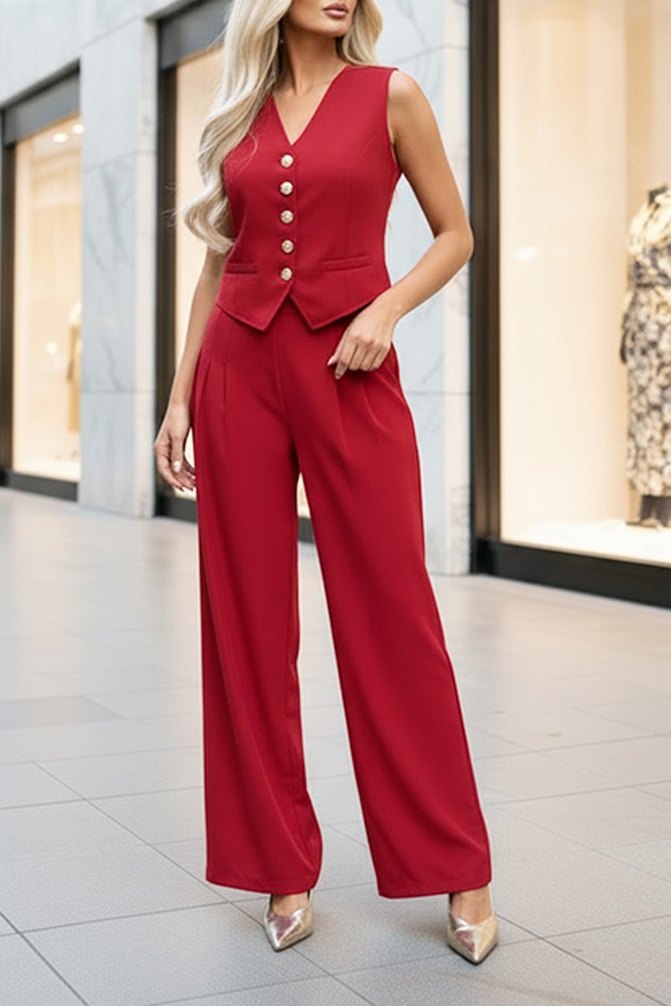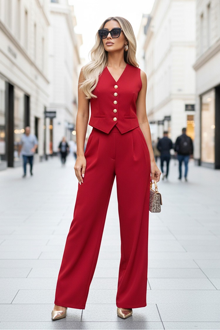 - Egy piros színű kétrészes szett - nadrág és mellény, amely illik a stílusos mindennapokhoz.