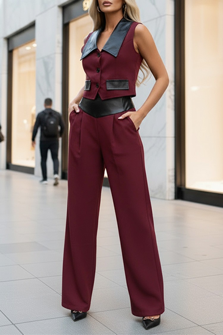 - Bordó színű kétrészes szett - nadrág és mellény, amely stílusos mindennapokra és irodába egyaránt alkalmas.