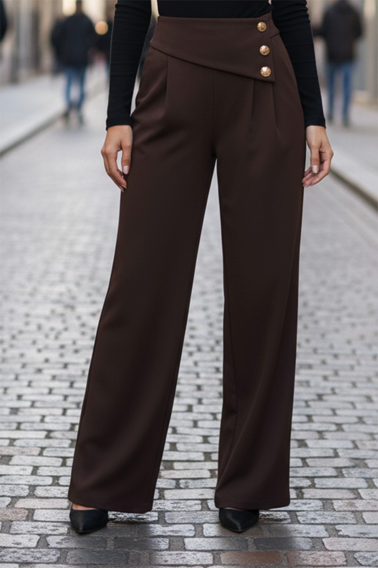 - Női nadrág látványos magas derekú szabással és elegáns gombokkal az elegáns mindennapi megjelenésért.