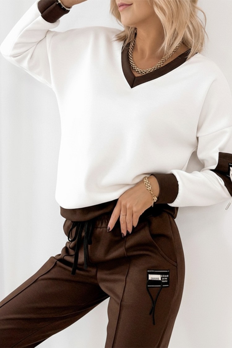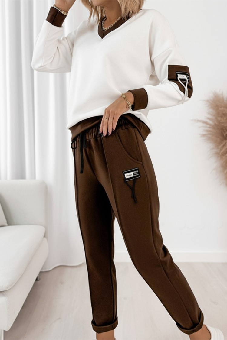 - Vonzó kétrészes szett, amely egy felsőből és egy nadrágból áll.