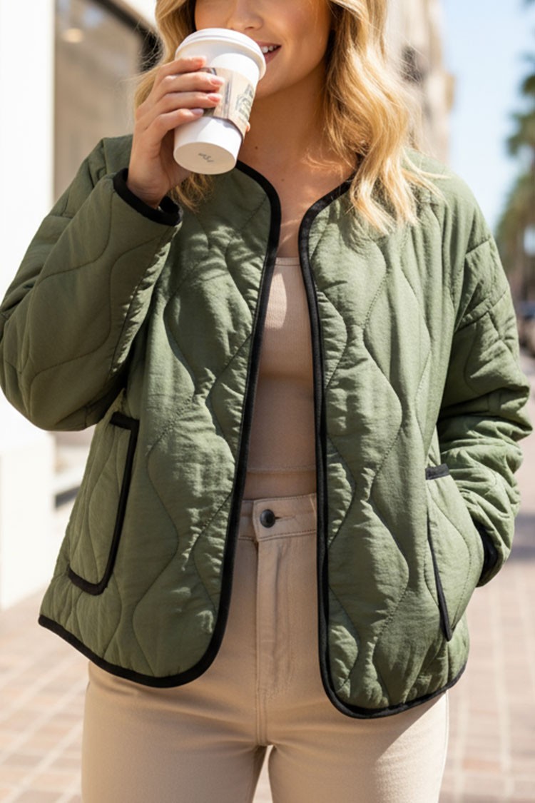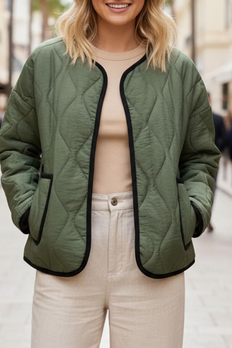 - A modell kényelmes szabással, praktikus oldalsó zsebekkel és zöld színű steppelt mintával rendelkezik.