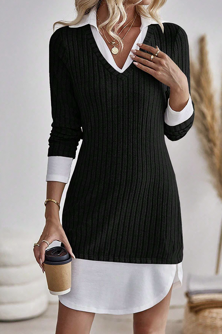 - A ruha bő szabású, hosszú ujjú és V dekoltázsú.