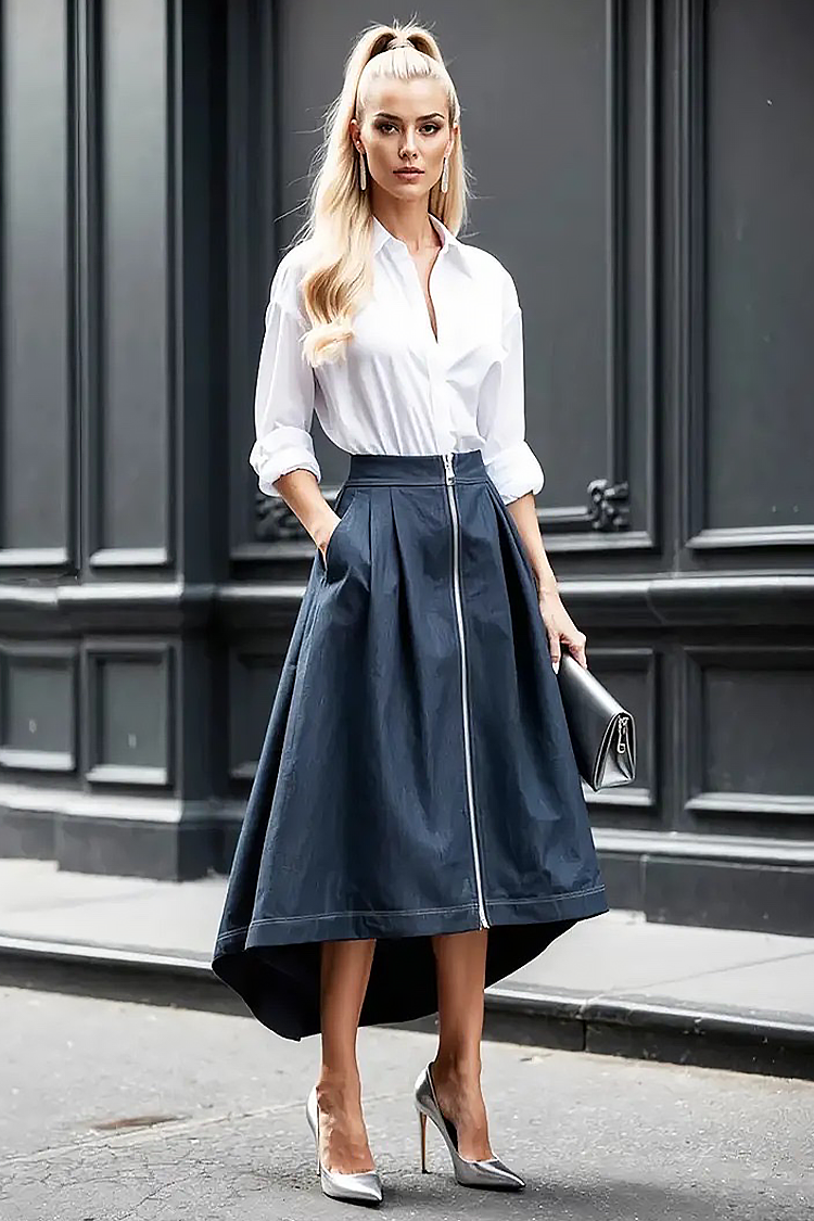 - A szoknya aszimmetrikus hosszúságú, magas, rugalmas derekú és elöl cipzáras.