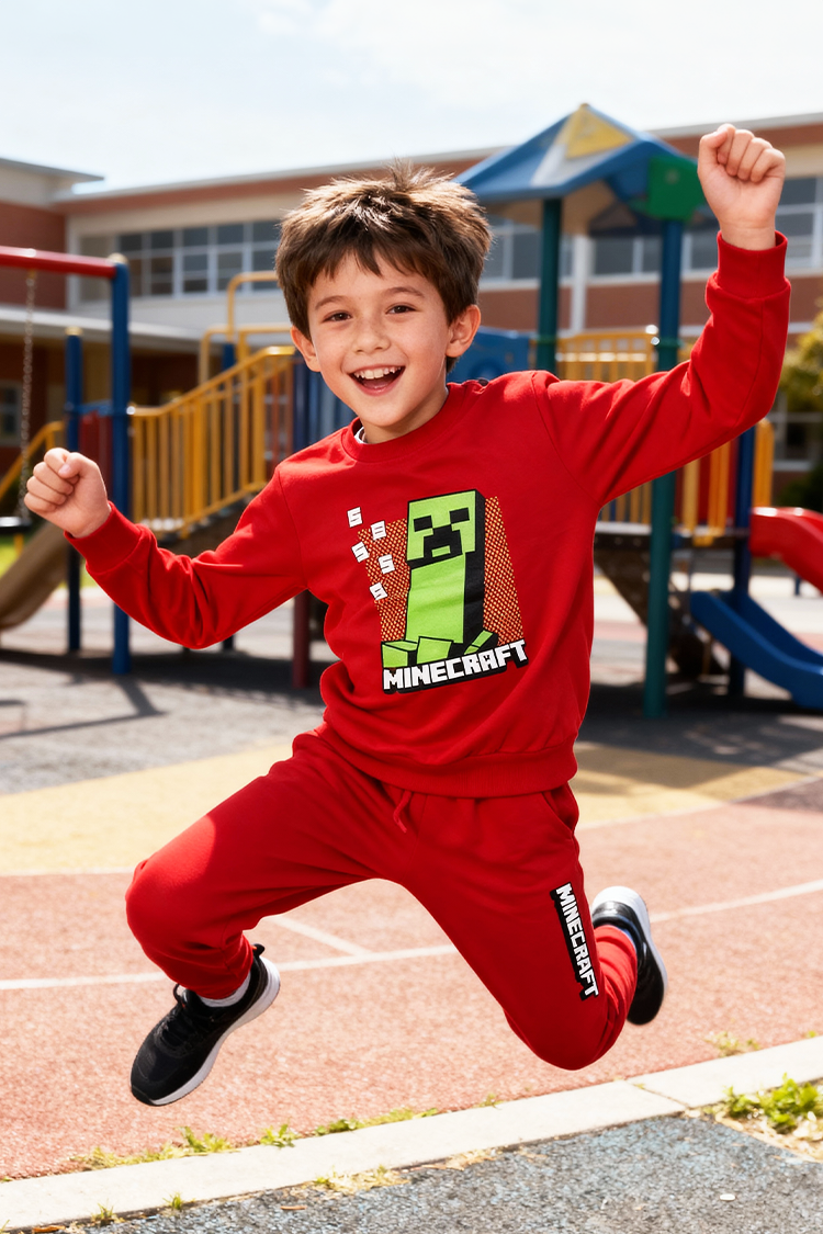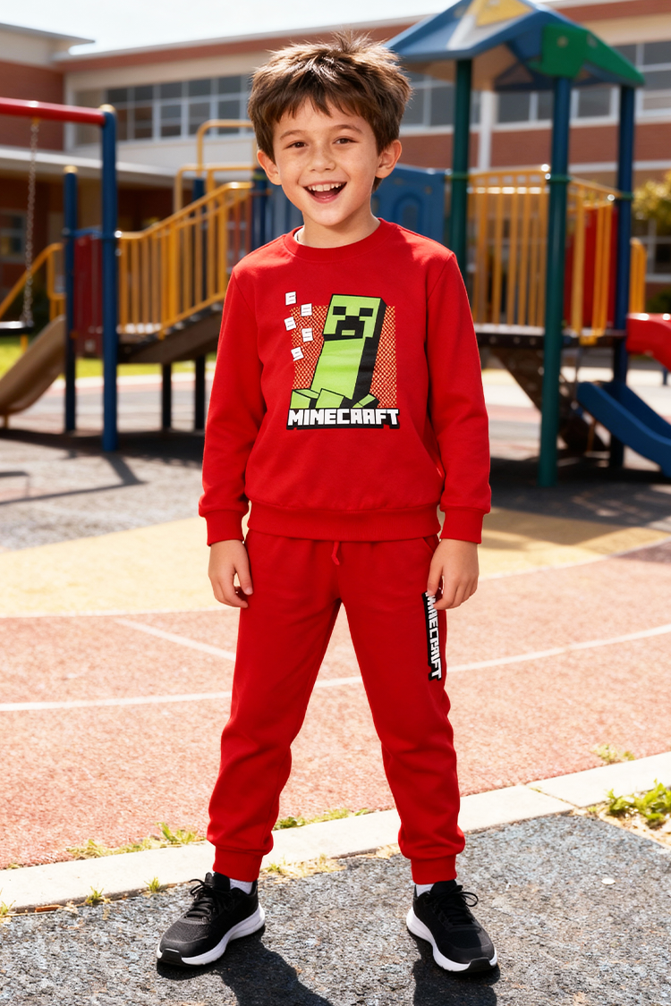 - Kétrészes gyermek szett, amely egyszínű, Minecraft mintás felsőből és nadrágból áll.