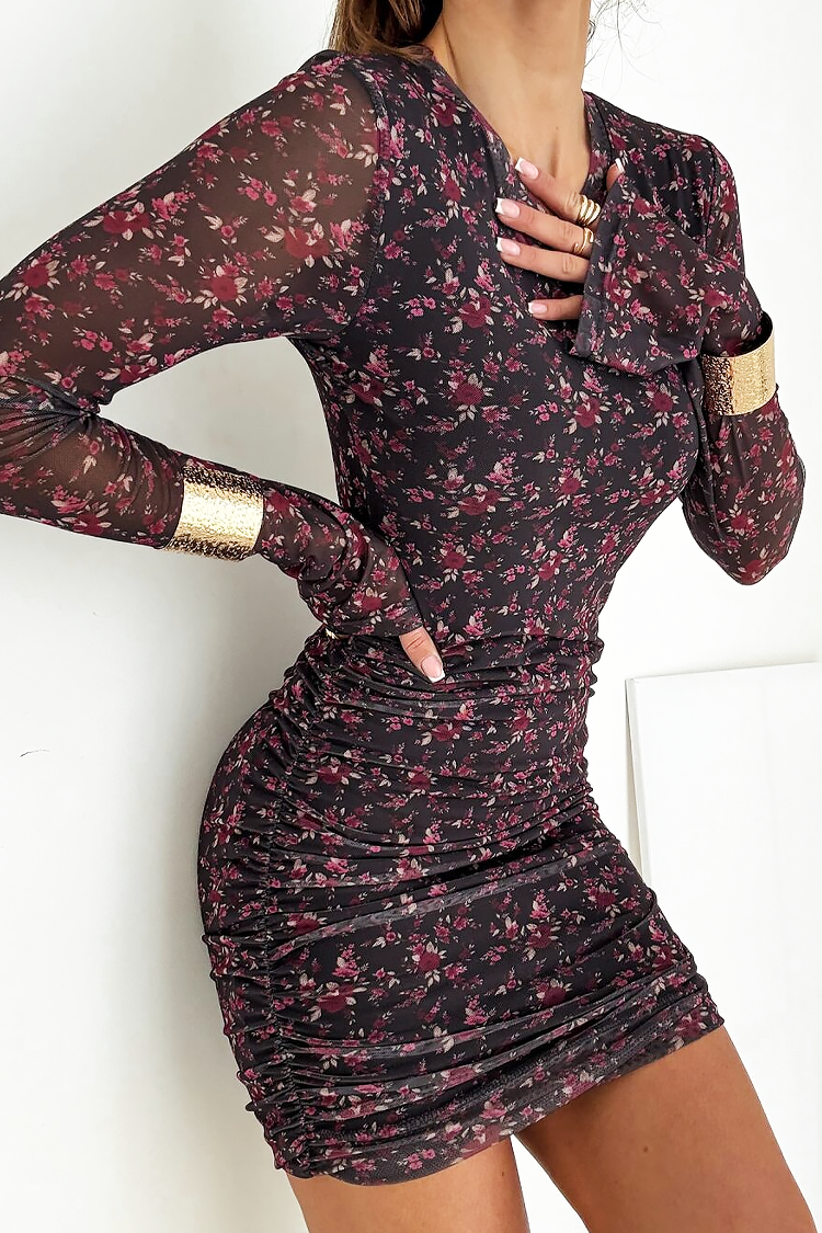 - A ruha testhezálló szabású, hosszú ujjú és virágmotívumokkal rendelkezik.
