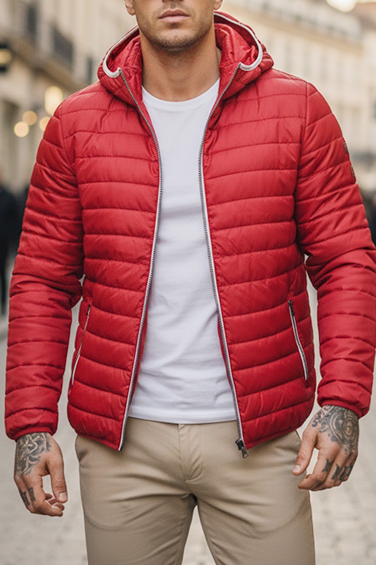 - Kényelmes férfi dzseki vízszintesen steppelt mintával, piros színben, sportos-hétköznapi stílusban.