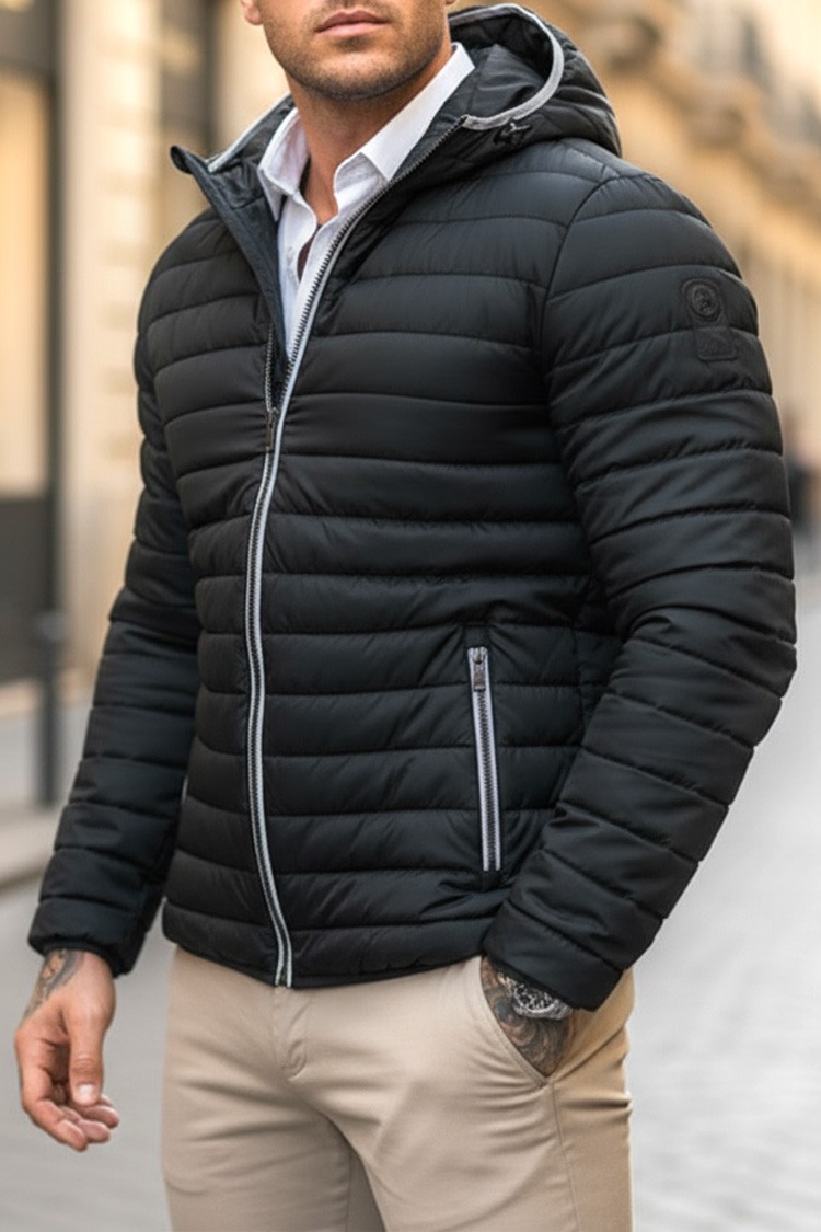 - Kényelmes férfi dzseki vízszintesen steppelt mintával, fekete színben, sportos-hétköznapi stílusban.