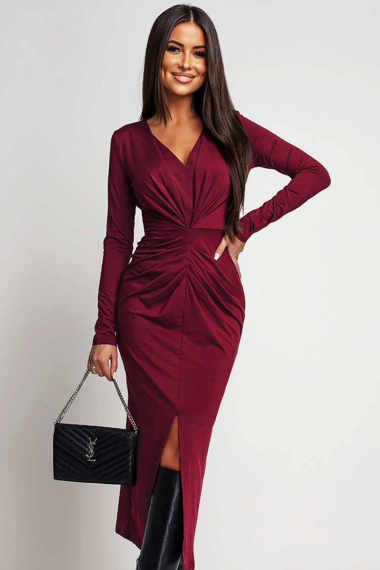 - A ruha hosszú ujjú, testhezálló szabású, V dekoltázzsal, látványos ráncolással és sliccel rendelkezik.