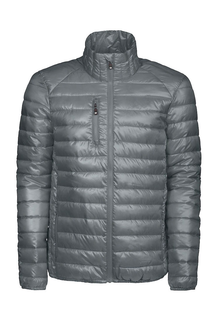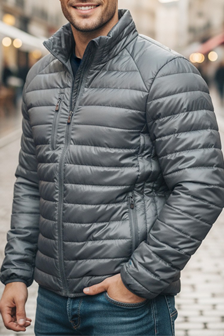 - Kényelmes férfi dzseki szürke színben, középső cipzárral és zsebekkel.