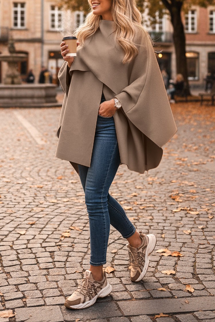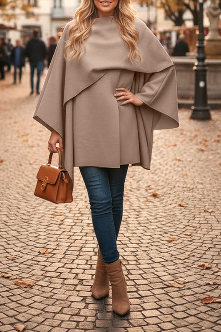- A modell aszimmetrikus szabással, bő, látványos ujjakkal és mokka színnel rendelkezik.
