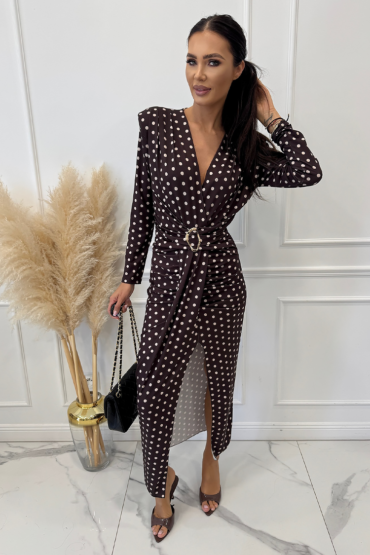 - A ruha hosszú ujjú, testhezálló szabású, V dekoltázzsal és látványos, fém díszítésű övvel rendelkezik.