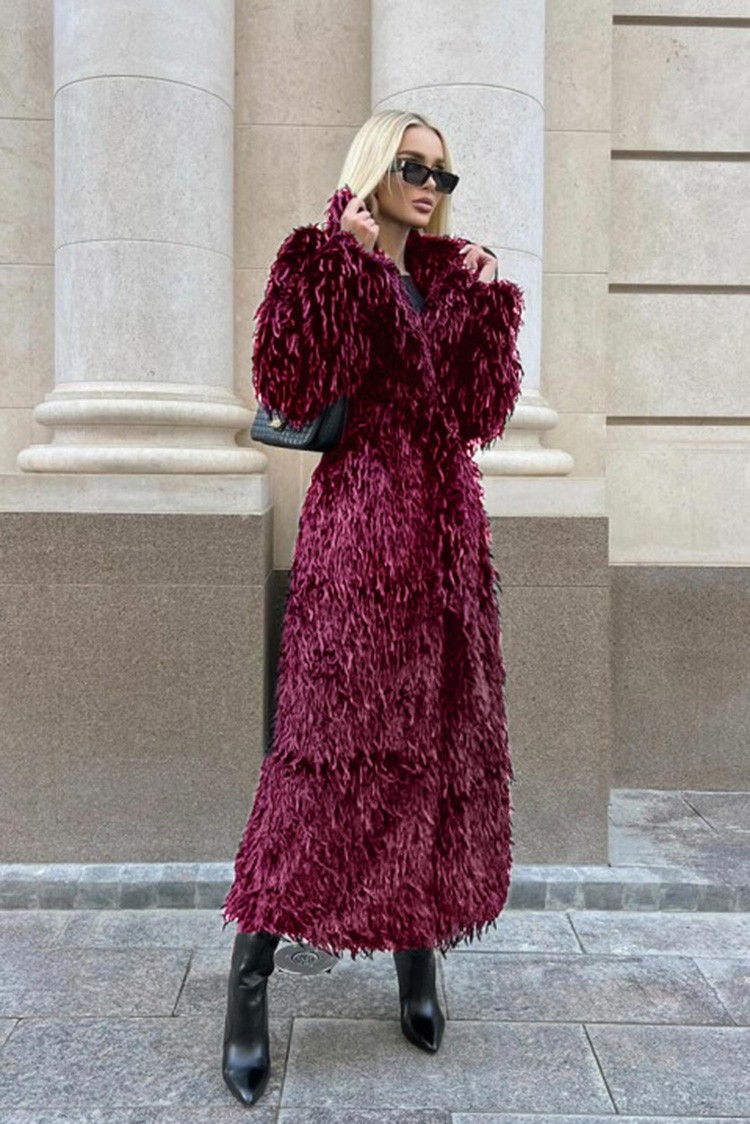 - A kabát kényelmes szabású, hosszú, a derekán azonos anyagból és tónusú övvel rendelkezik.