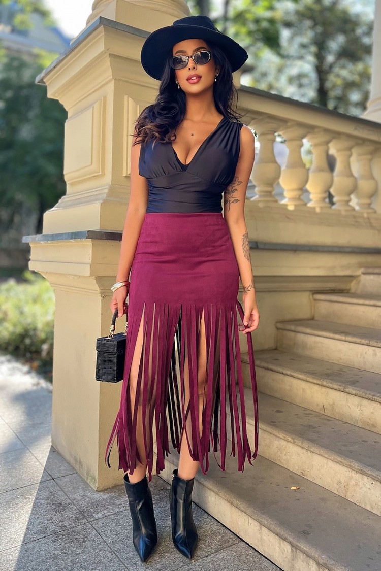 - Trendi midi szoknya szexi dizájnnal, öko velúrból, mindennapi divatos megjelenéshez.