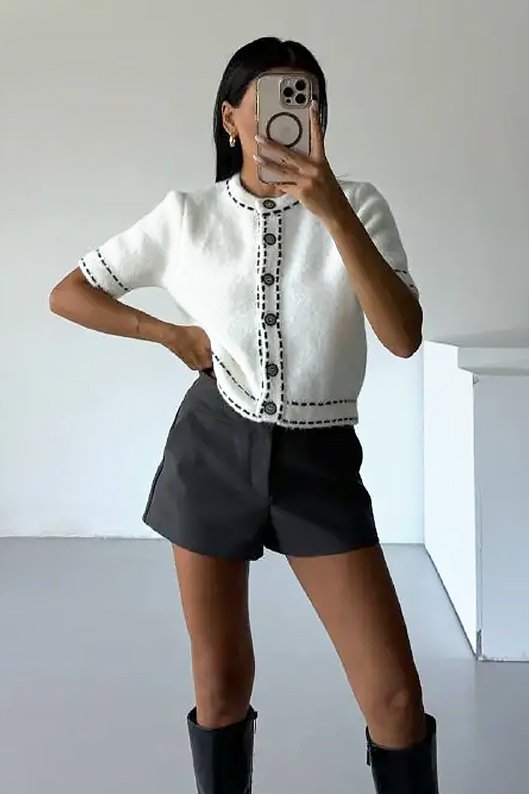 - Puha és meleg női kardigán rövid ujjal, amely alkalmas a mindennapi divatos megjelenéshez.