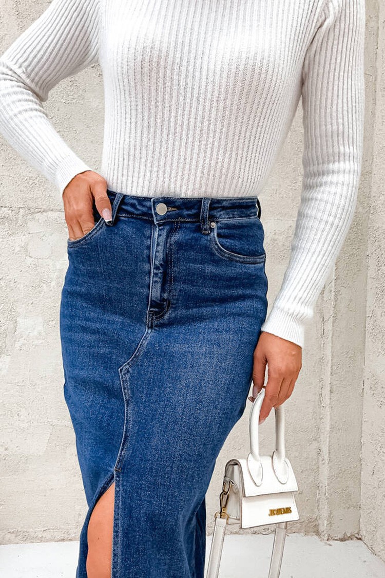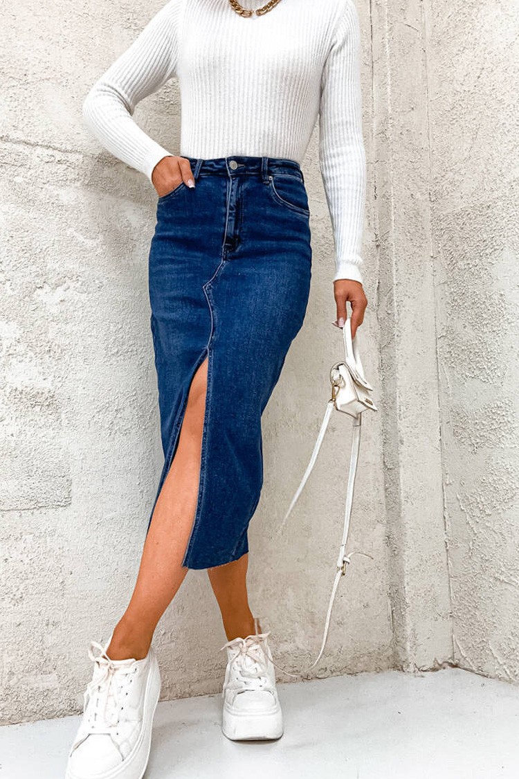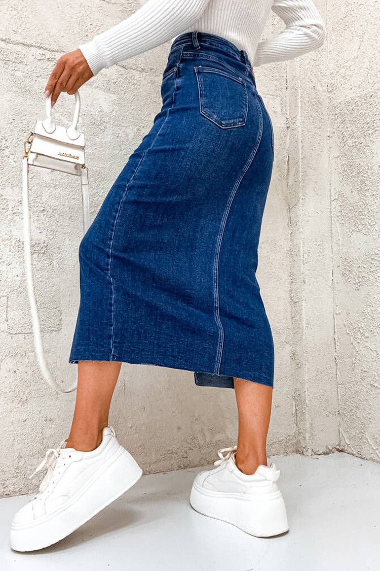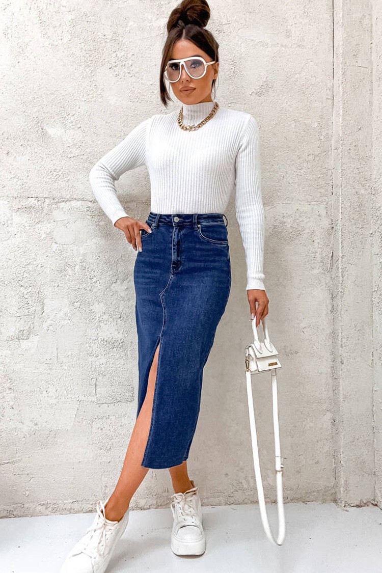 - Trendi megjelenésedhez válaszd ezt a farmer midi szoknyát, amely különféle divatos kombinációkhoz illik.