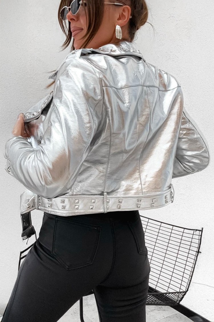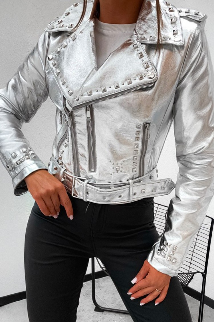 - A modell kényelmes szabással, stílusos gallérral, cipzáras záródással, zsebekkel és látványos szegecsekkel.