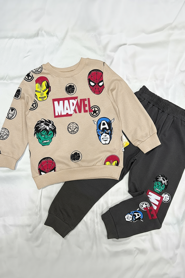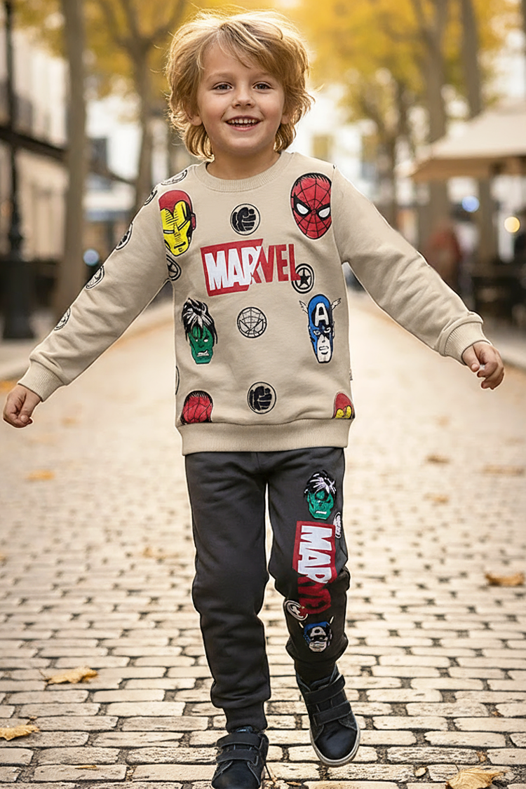 - A felső hosszú ujjú és Marvel mintás, a nadrág pedig magas és rugalmas derékkal rendelkezik.