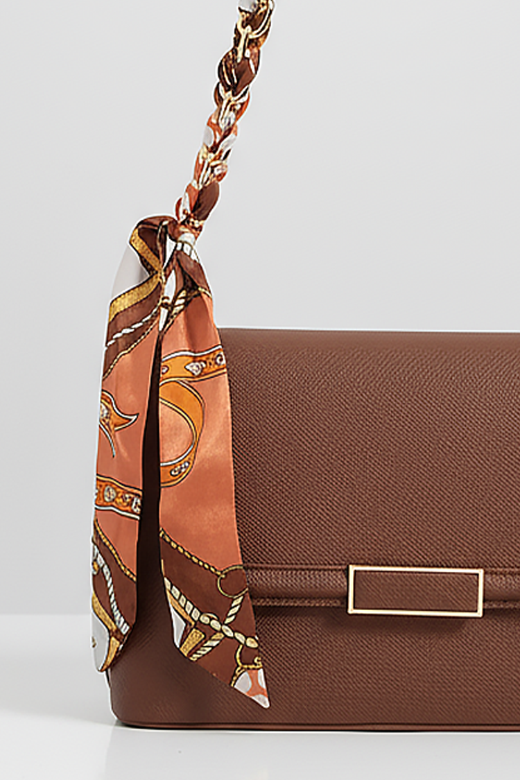 - A táska hosszú fogantyúval, látványos zárral és stílusos sállal díszített.