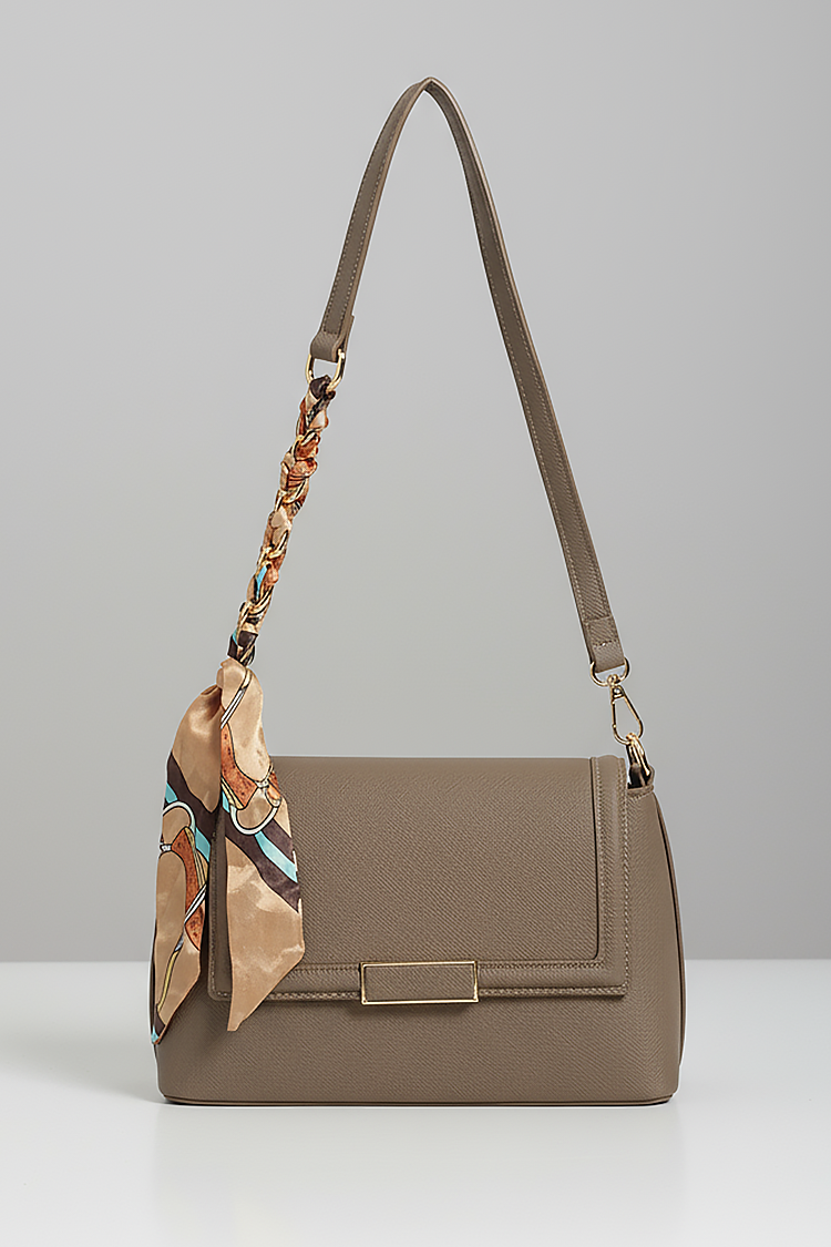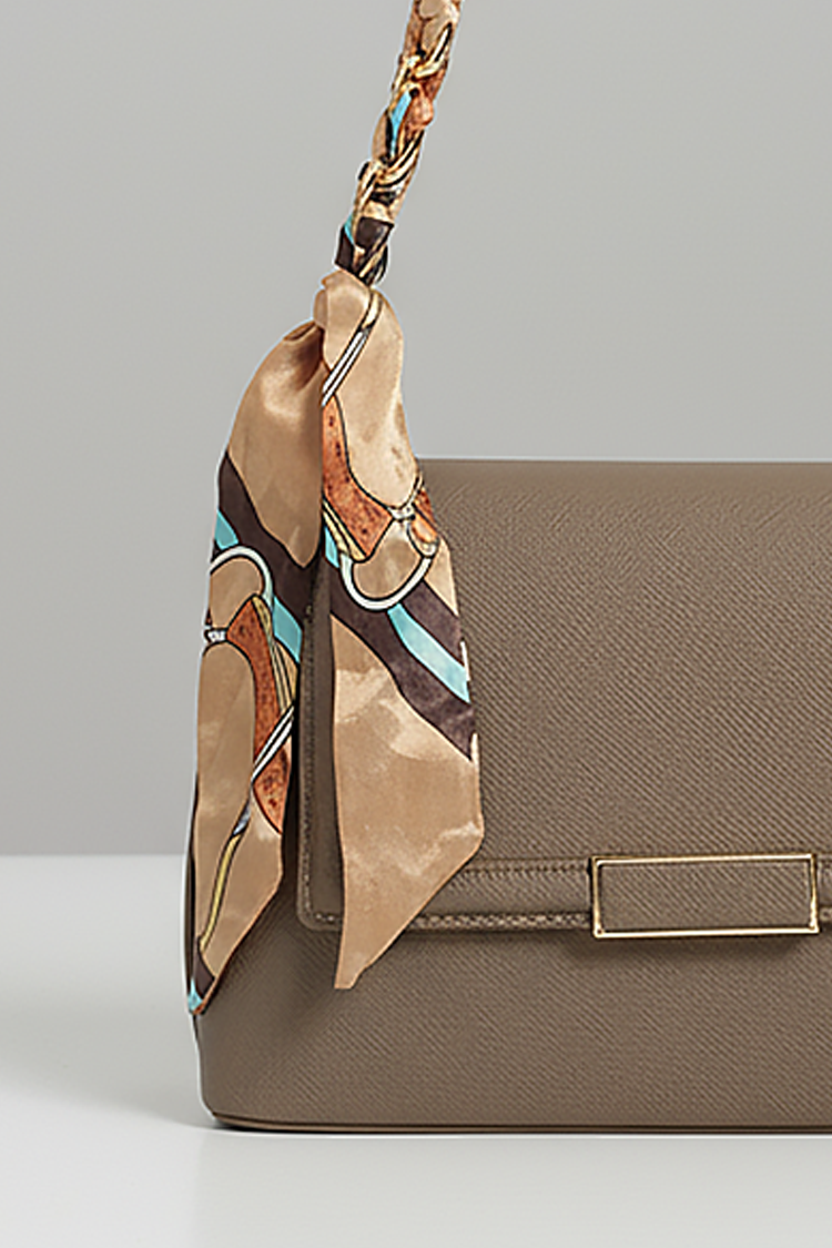 - A táska hosszú fogantyúval, látványos zárral és stílusos sállal díszített.