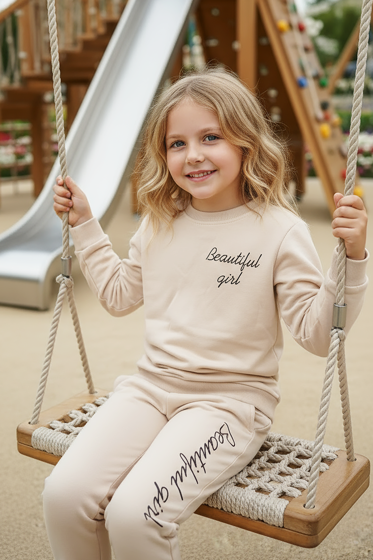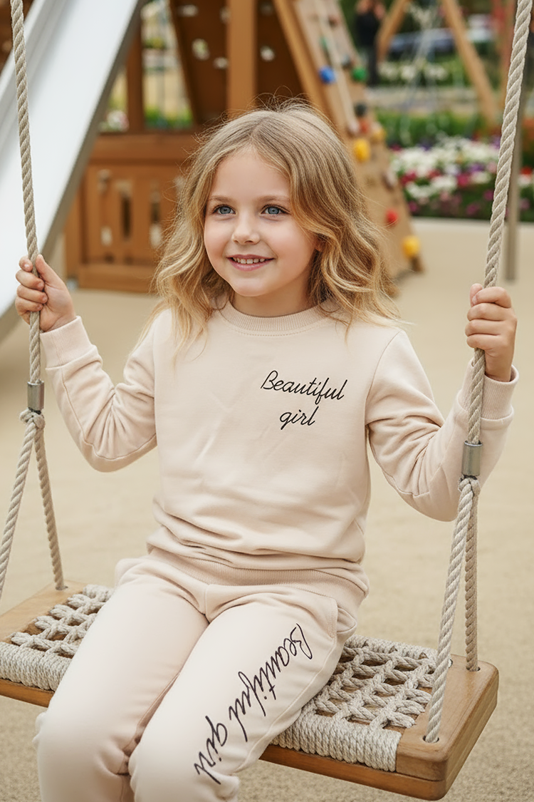 - Kétrészes gyermek szett kislányoknak, amely egy felsőből és egy nadrágból áll, vonzó felirattal.
