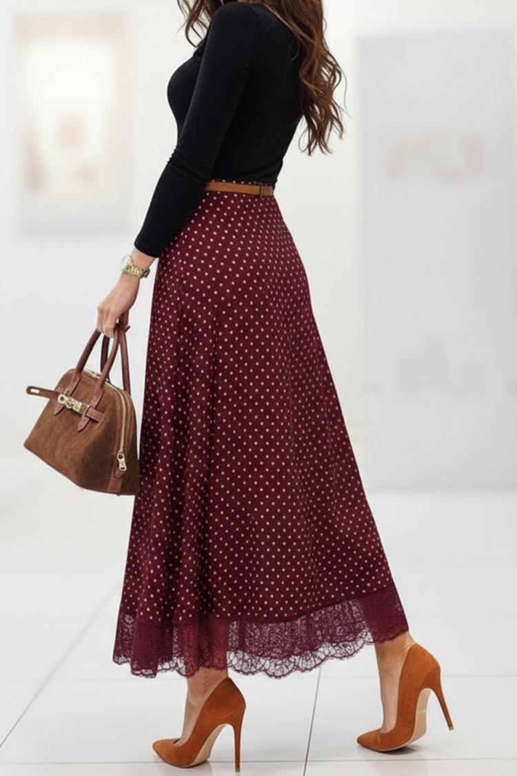 - A modell precíz szabású, magas derekú, pöttyös mintás, csipkével.
