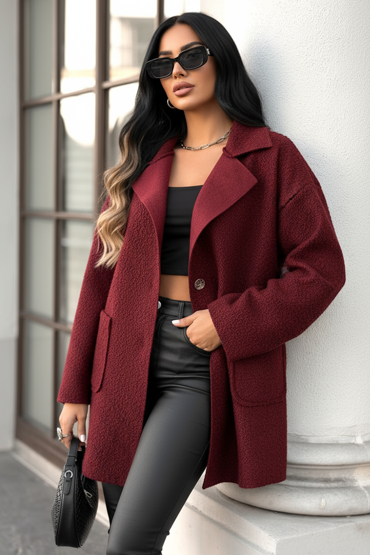 - A modell kényelmes, túlméretezett szabással, zsebekkel, gallérral és gombos rögzítéssel rendelkezik.