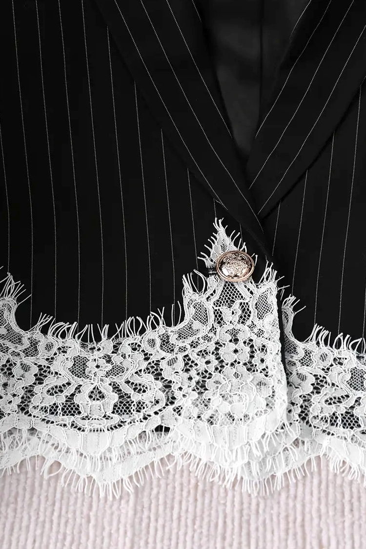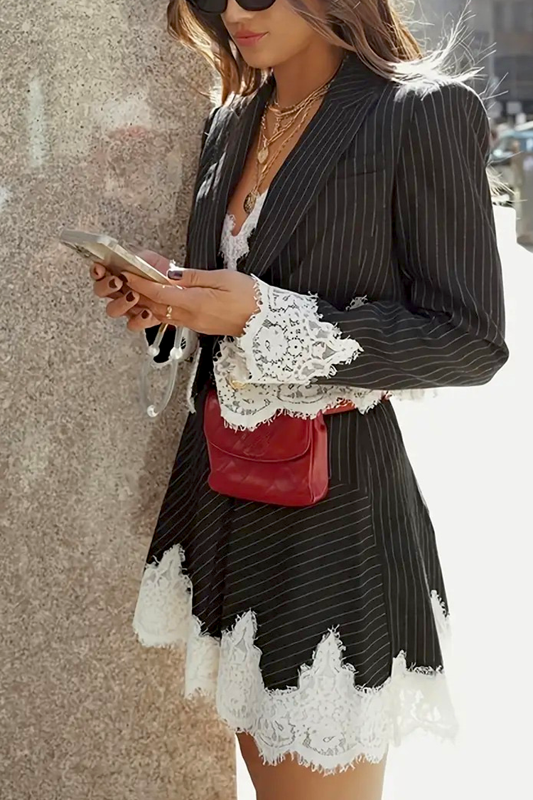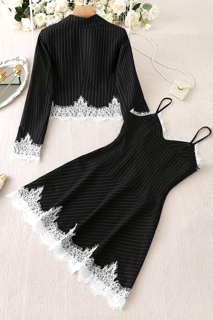 - Egy vonzó, kétrészes szett, amely egy ruhából és egy csipkés, csíkos mintás kabátkából áll.