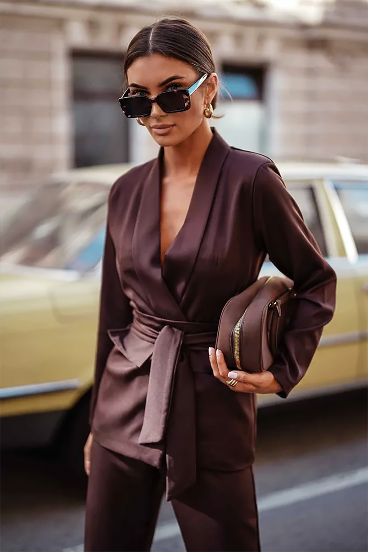 - A nadrág magas derekú és széles szárú, a blézer pedig elegáns kialakítású, gallérral és övvel rendelkezik.