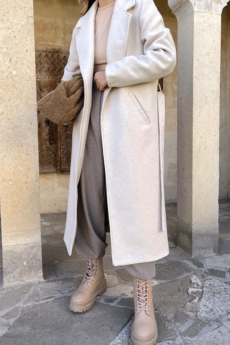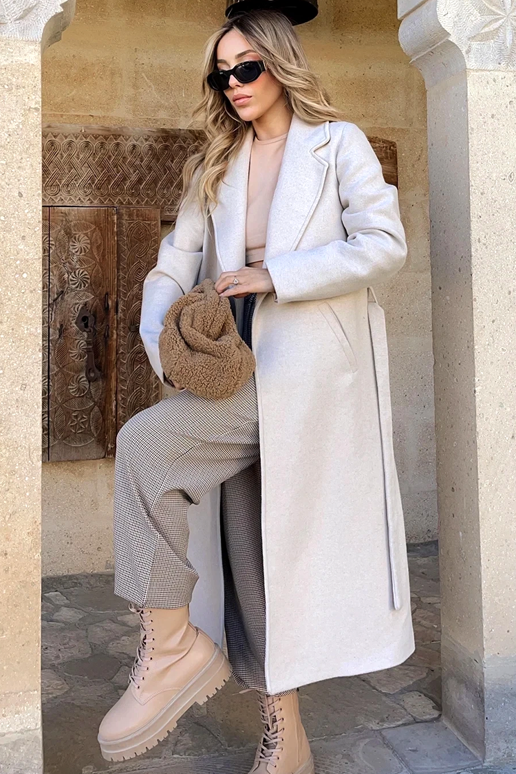 - A modell kényelmes szabással, gallérral, zsebekkel és övvel rendelkezik, amelyek ugyanabból az anyagból készültek.