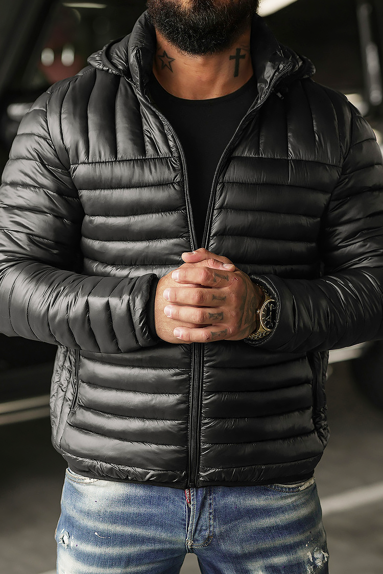 - Kényelmes férfi dzseki steppelt mintával, fekete színben és kapucnival, sportos-hétköznapi stílusban.