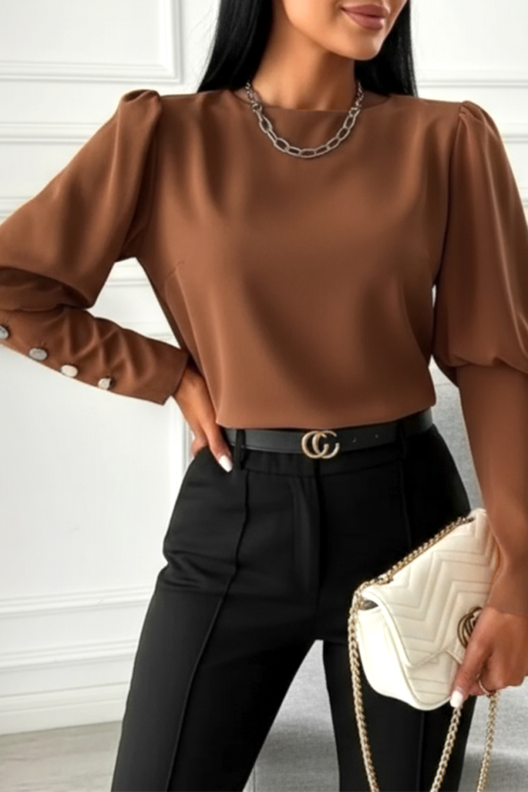 - A blúz hosszú ujjú és kényelmes szabású.
