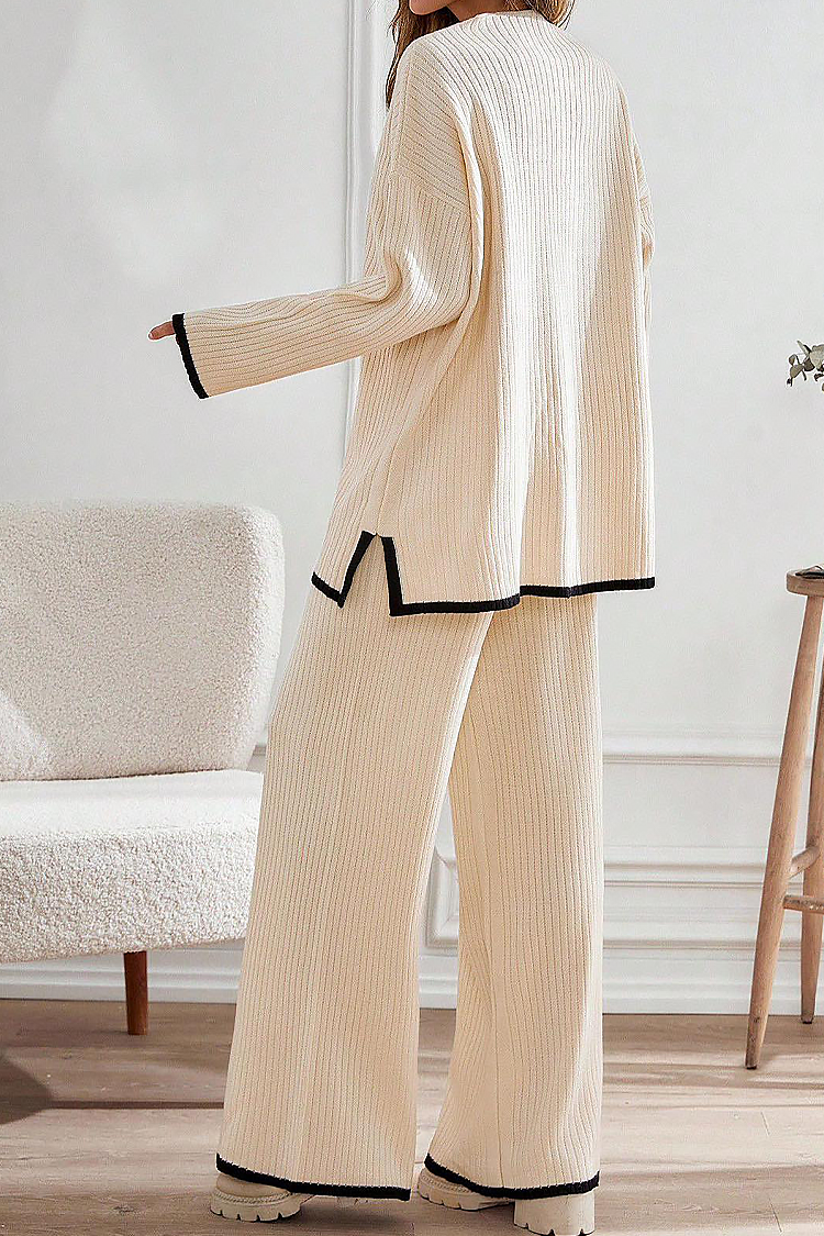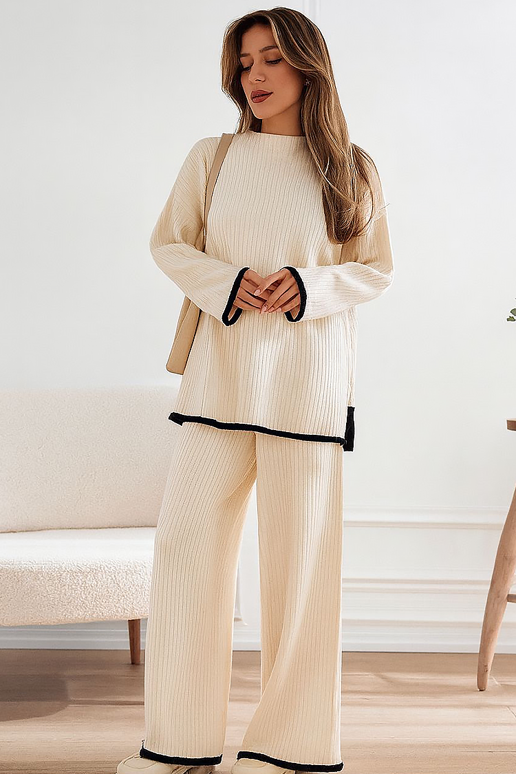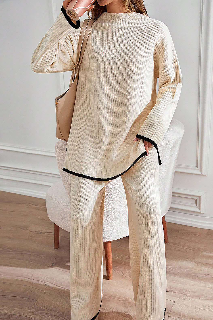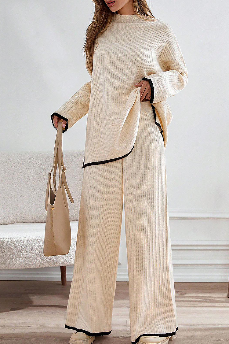 - A pulóver kényelmes szabással és klasszikus nyakkivágással rendelkezik, a nadrág pedig magas és rugalmas derékkal rendelkezik.