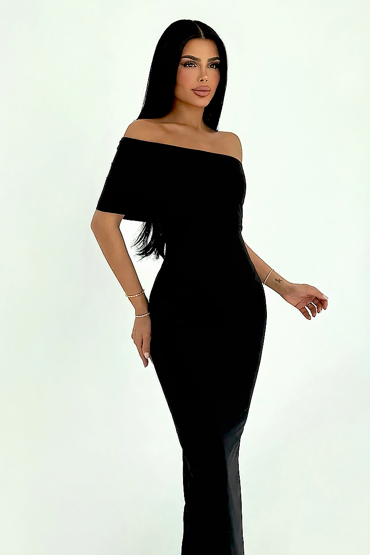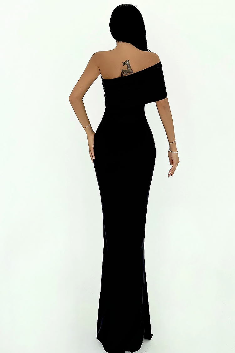 - A modell testhezálló szabással rendelkezik, amely kiemeli az alakot, és látványos aszimmetrikus dekoltázzsal.