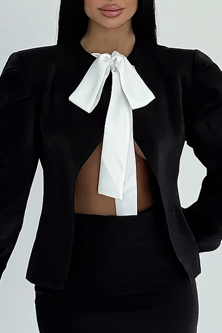 - A blúz elegáns fazonú, hosszú ujjú és elöl díszítő szalaggal díszített, a szoknya pedig testhezálló, szexi szabású.