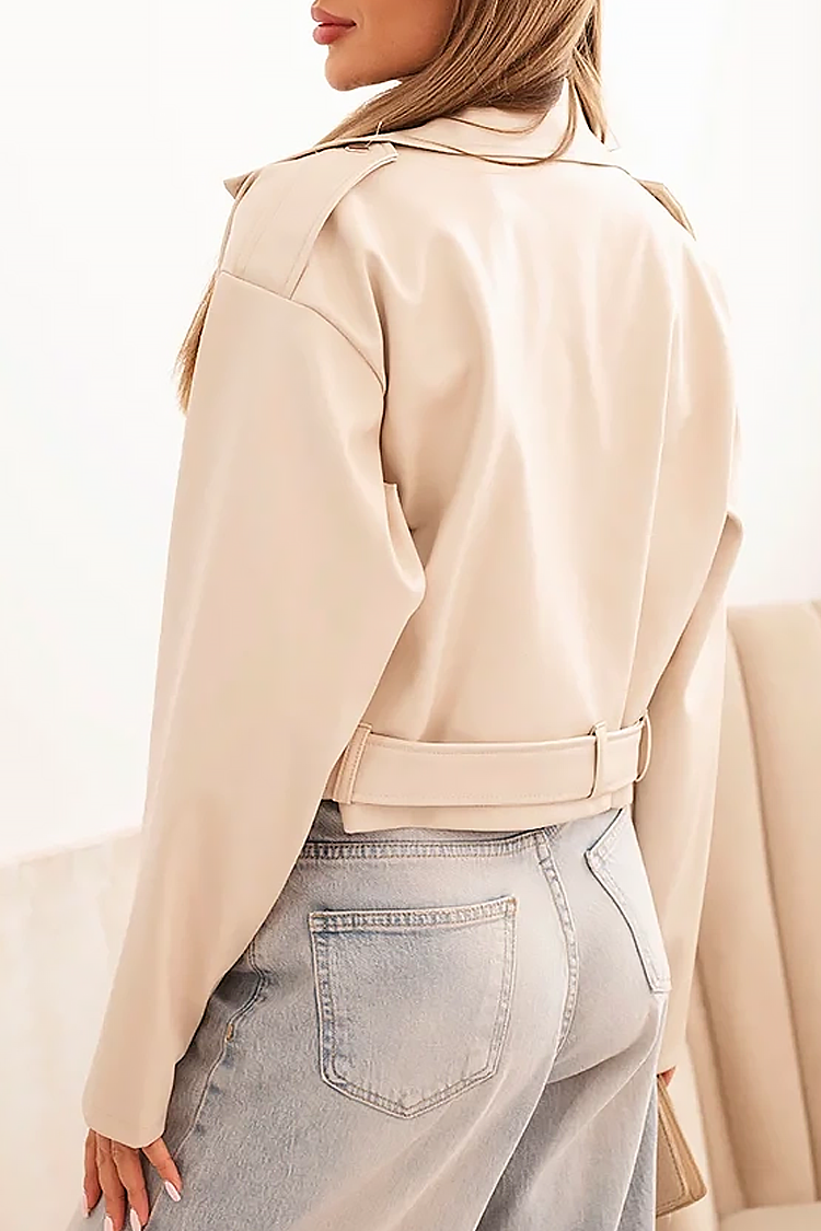 - A modell kényelmes szabással, stílusos gallérral, cipzáras zárral és ugyanabból az anyagból készült övvel rendelkezik.