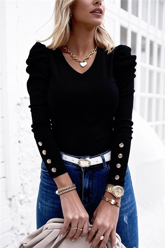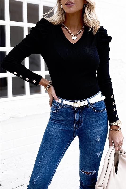 - A felső klasszikus és kényelmes szabású, kacér dizájnnal és gombokkal az ujjakon.