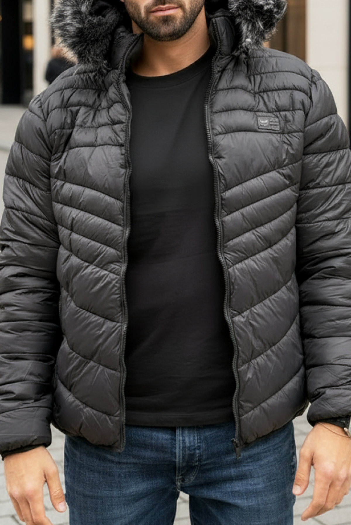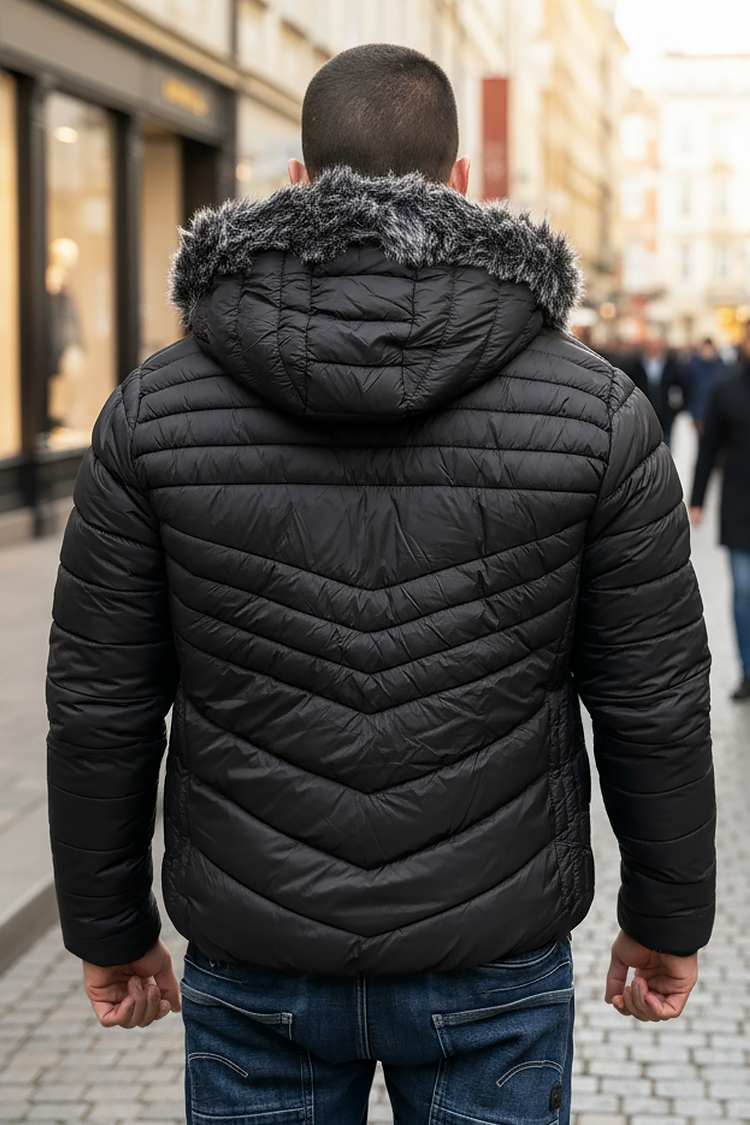 - Mindennapi modell, férfi télikabát meleg béléssel és steppelt mintával, fekete színben.