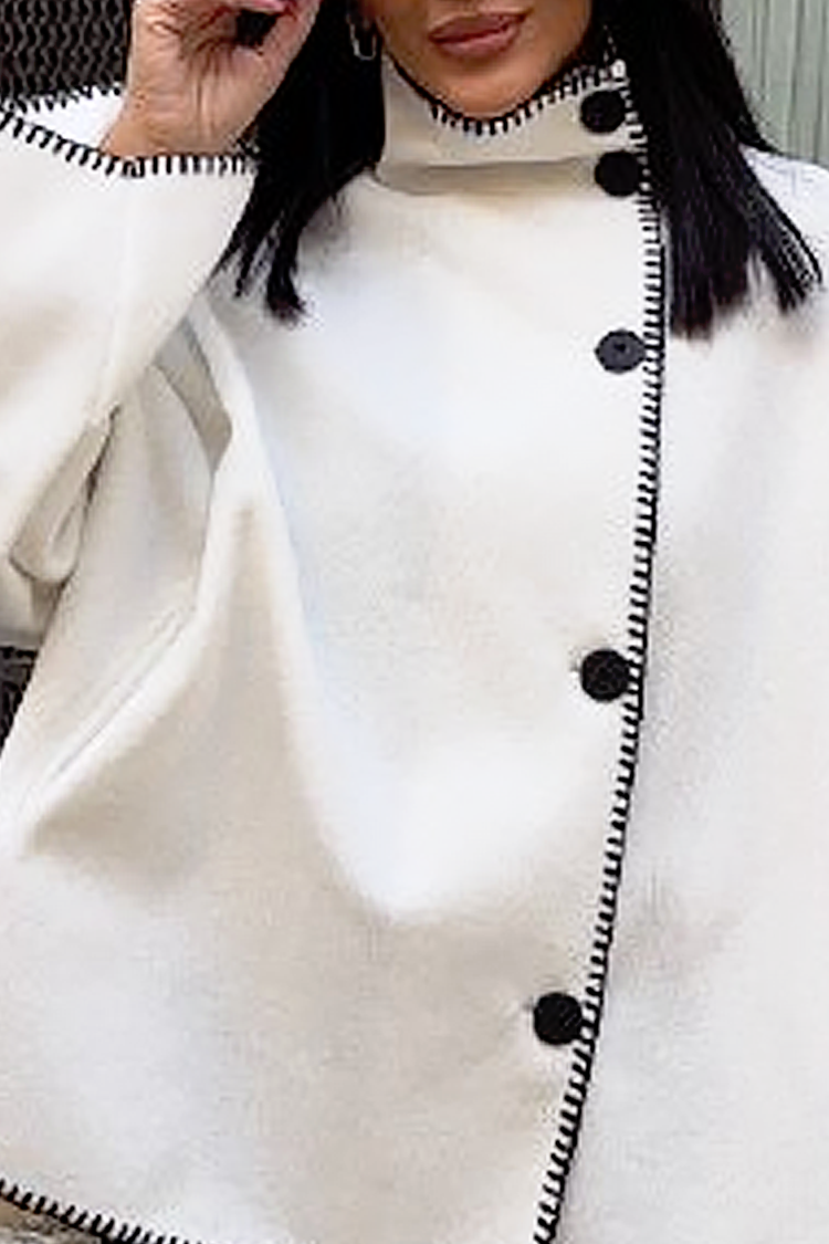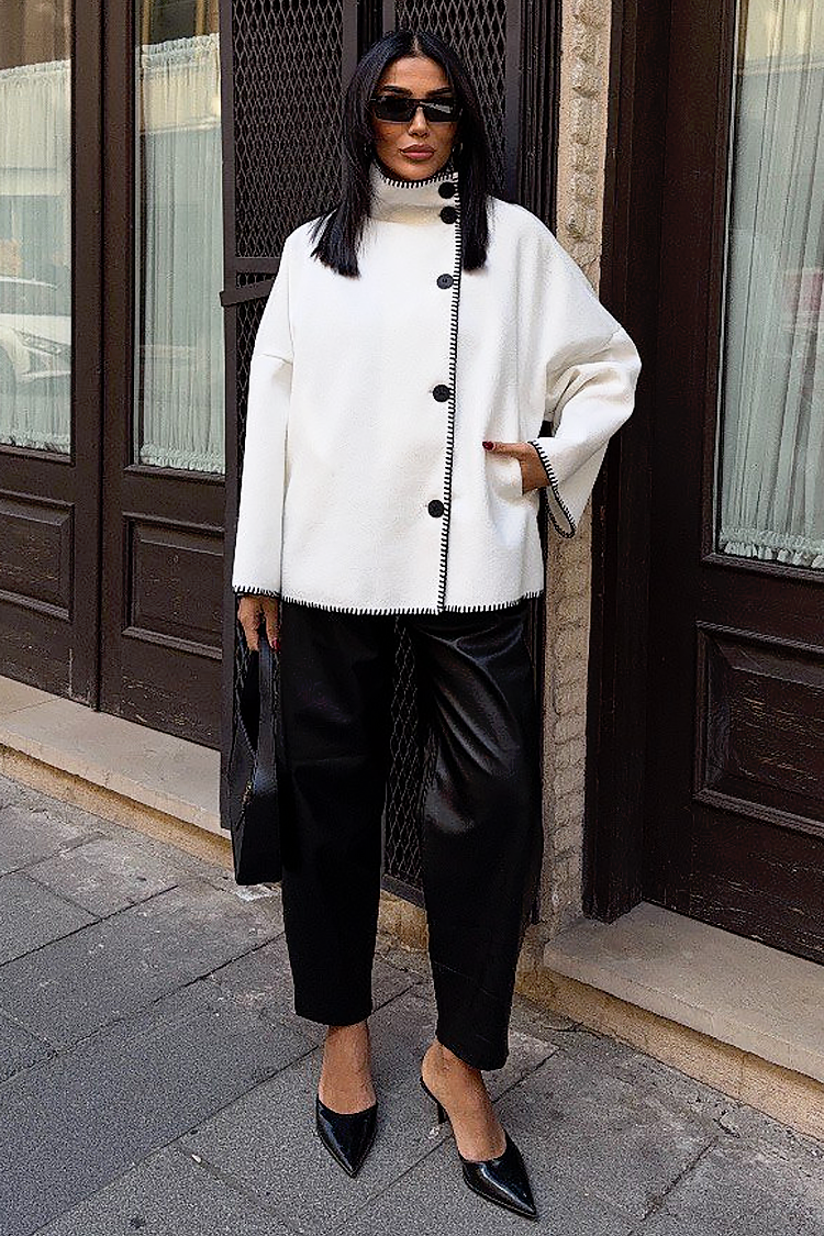 - A modell stílusos, túlméretezett szabással, elegáns gallérral és gombokkal rendelkezik teljes hosszában.