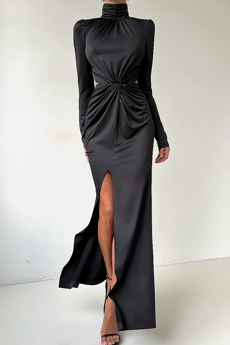 - A modell magas gallérral, látványos sliccel és hátul kivágással rendelkezik.