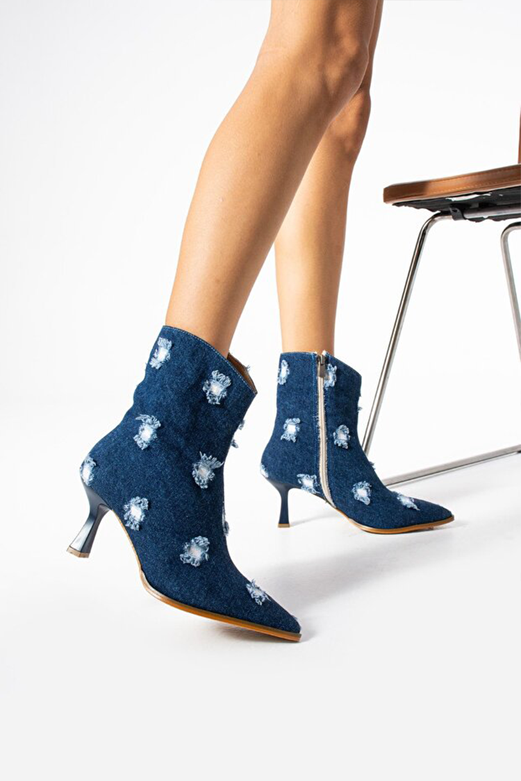 - A legújabb divatirányzat a cipők között - stílusos csizma vékony, 9 cm-es sarokkal, kék, farmerhatású anyagból.