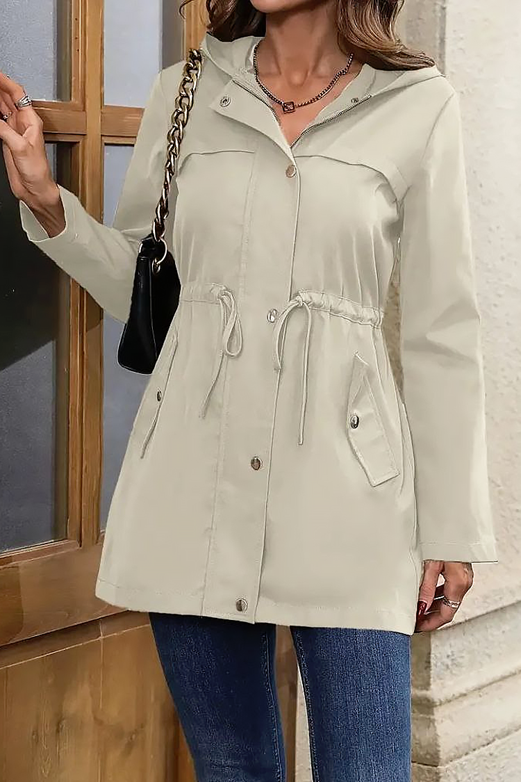 - A modell kényelmes szabással, kapucnival, övvel, gombokkal és zsebekkel rendelkezik.