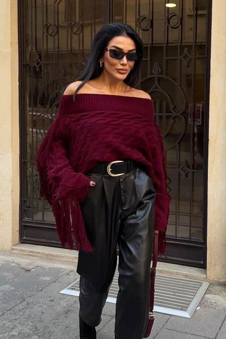 - A modell túlméretezett szabással, látványos rojtokkal az ujjakon, ejtett vállakkal rendelkezik.