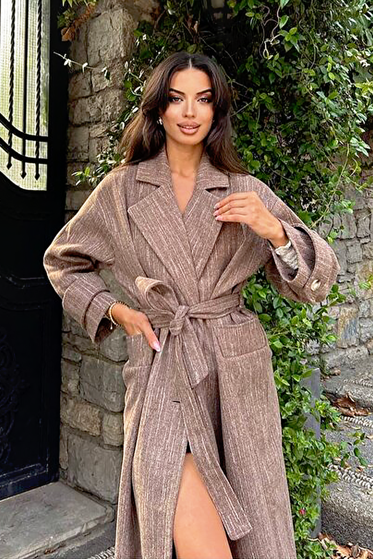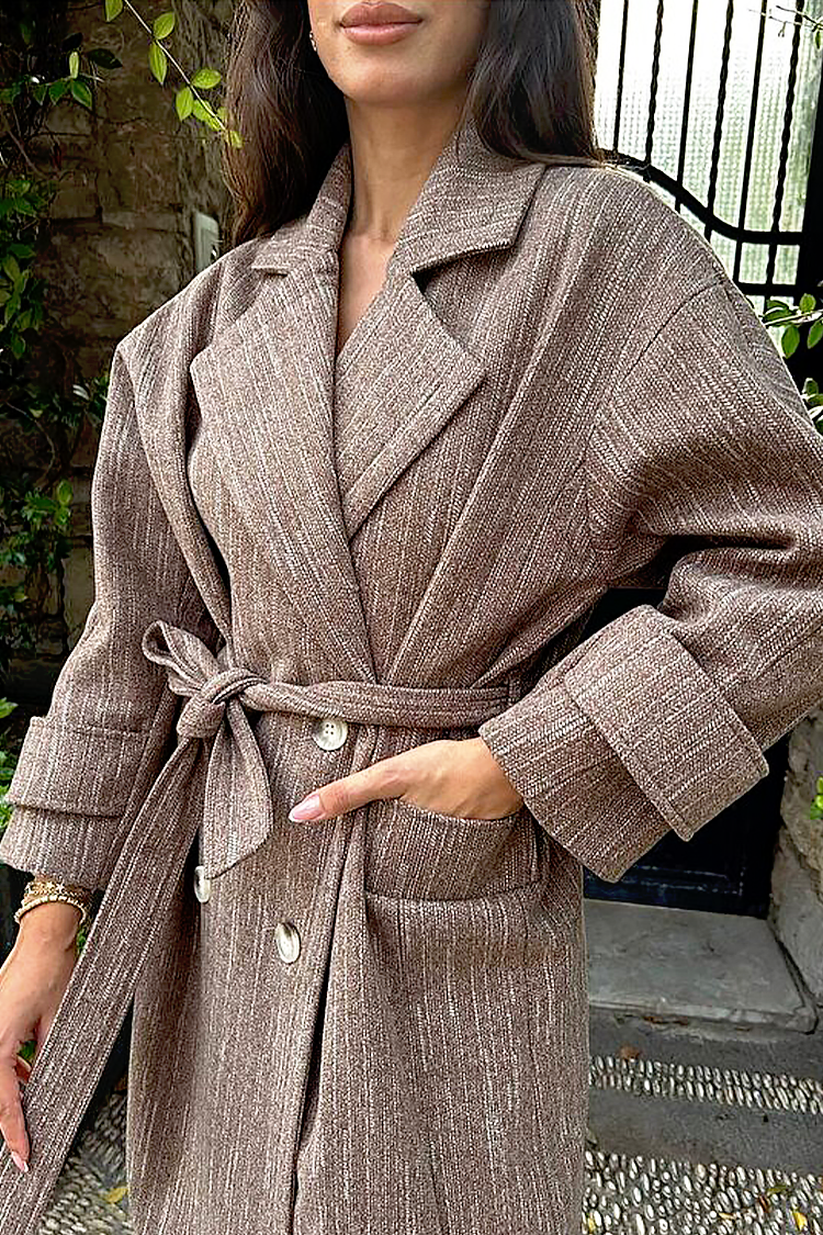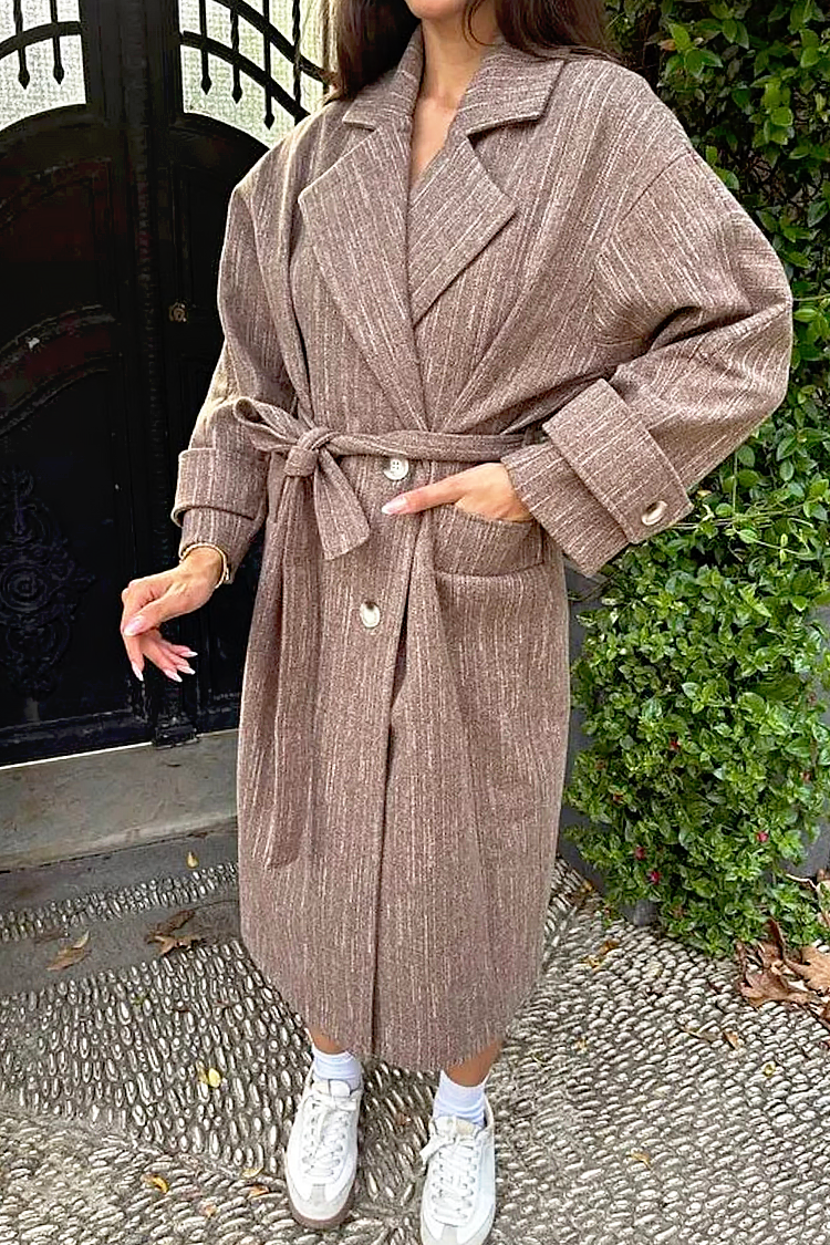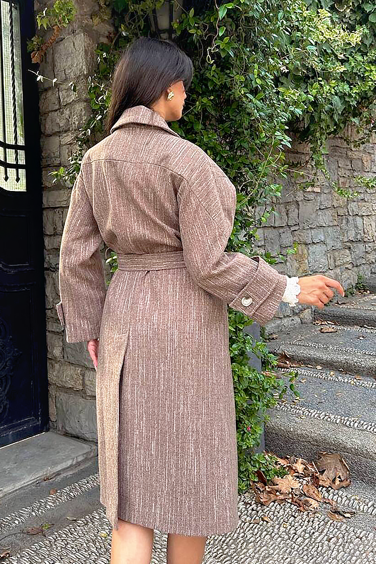 - A modell klasszikus szabású, látványos mandzsettákkal, ugyanabból az anyagból készült övvel és dupla soros gombolással rendelkezik.